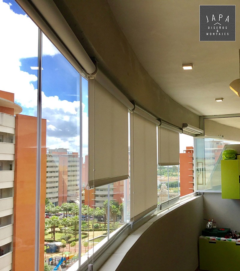 En este piso, la solución de espacio que propusimos al cliente fue la instalación de una cortina de cristal con estores. Con el cerramiento, la terraza puede aprovecharse en cualquier época del año sin depender de la lluvia, el viento o el frío. El aislamiento térmico no solo es beneficioso en otoño o invierno; en verano también nos permite enfriar la zona si deseamos permanecer en ella.